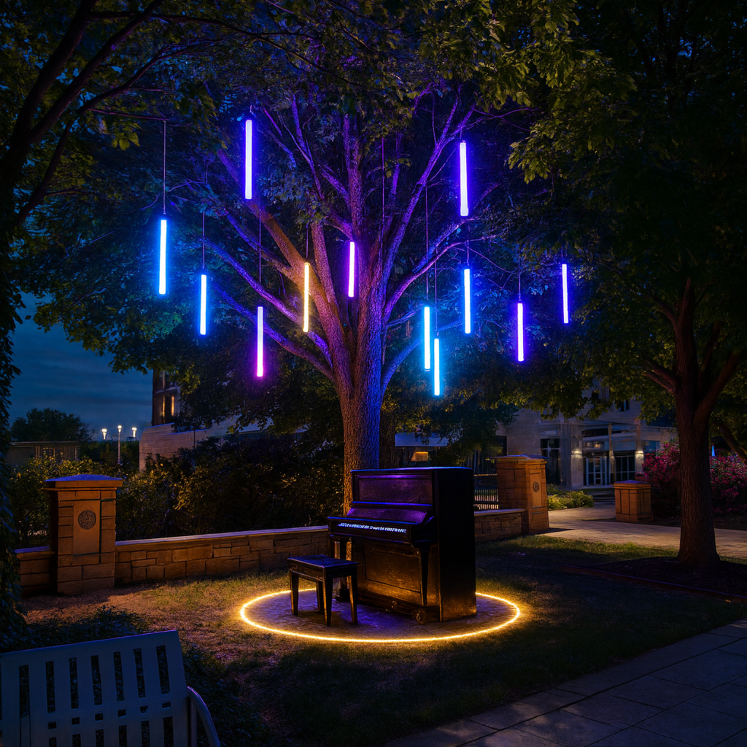 Every note sparks light in this one-of-a-kind performance where music and visuals collide. Renowned pianists transform McConnell Plaza into a glowing concert hall, merging timeless songs with dazzling light displays that pull the crowd into the rhythm all night long.